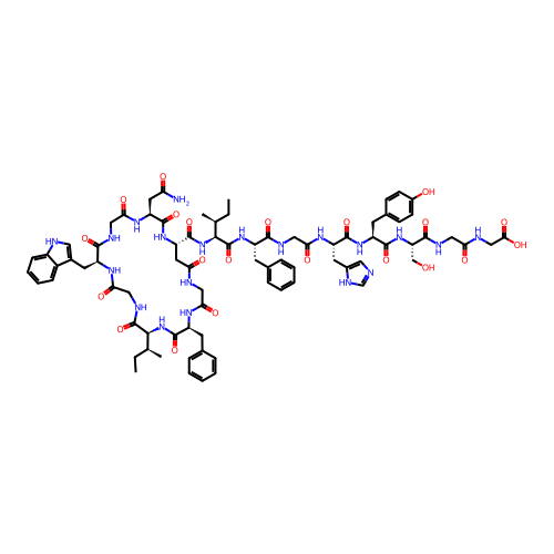 | SMILES | CC[C@H](C)[C@@H]1NC(=O)[C@H](CC2=CC=CC=C2)NC(=O)CNC(=O)C[C@@H](C(=O)N[C@H](C(=O)N[C@@H](CC2=CC=CC=C2)C(=O)NCC(=O)N[C@@H](CC2=CN=C[NH]2)C(=O)N[C@@H](CC2=CC=C(O)C=C2)C(=O)N[C@@H](CO)C(=O)NCC(=O)NCC(=O)O)[C@@H](C)CC)NC(=O)[C@H](CC(N)=O)NC(=O)CNC(=O)[C@H](CC2=C[NH]C3=CC=CC=C23)NC(=O)CNC1=O |
