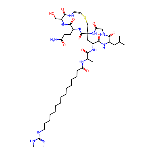 | InChI | InChI=1S/C45H78N12O10S/c1-29(2)24-32-39(63)51-26-37(61)57-45(28-68-23-22-49-40(64)34(27-58)55-41(65)31(56-43(45)67)19-20-35(46)59)25-33(42(66)53-32)54-38(62)30(3)52-36(60)18-16-14-12-10-8-6-7-9-11-13-15-17-21-50-44(47-4)48-5/h22-23,29-34,58H,6-21,24-28H2,1-5H3,(H2,46,59)(H,49,64)(H,51,63)(H,52,60)(H,53,66)(H,54,62)(H,55,65)(H,56,67)(H,57,61)(H2,47,48,50)/b23-22- |