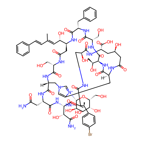 | SMILES | CC(/C=C/C1=CC=CC=C1)=C\[C@H](O)[C@@H]1CC(=O)N[C@@H](CO)C(=O)N[C@@H]2CN3C=C(C[C@H](NC(=O)C[C@H](O)C[C@@H](C(=O)O)NC(=O)[C@@H](O)CNC(=O)[C@H]([C@@H](C)C4=CC=C(Br)C=C4)NC(=O)[C@H]([C@@H](O)C(N)=O)NC(=O)[C@H](CC(N)=O)NC2=O)C(=O)N[C@@H]([C@H](C)O)C(=O)N[C@@H](CO)C(=O)N[C@@H](CC2=CC=CC=C2)C(=O)N1)[N+]([C@@H]1O[C@H](CO)[C@H](O)[C@H](O)[C@H]1O)=C3 |