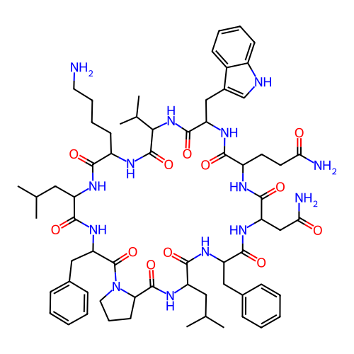 | SMILES | CC(C)CC1NC(=O)C(CCCCN)NC(=O)C(C(C)C)NC(=O)C(CC2=C[NH]C3=CC=CC=C23)NC(=O)C(CCC(N)=O)NC(=O)C(CC(N)=O)NC(=O)C(CC2=CC=CC=C2)NC(=O)C(CC(C)C)NC(=O)C2CCCN2C(=O)C(CC2=CC=CC=C2)NC1=O |