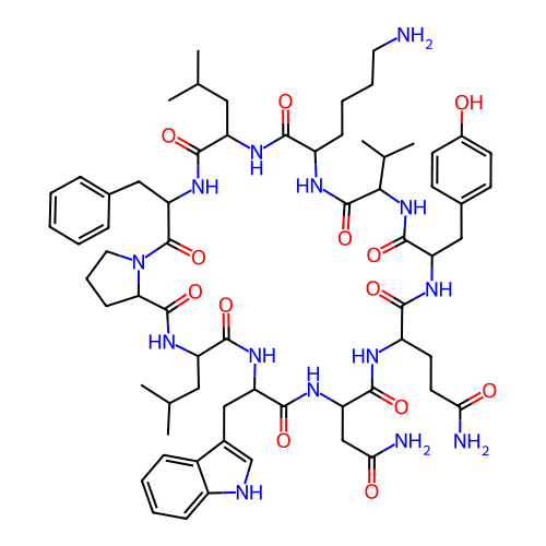 | SMILES | CC(C)CC1NC(=O)C(CCCCN)NC(=O)C(C(C)C)NC(=O)C(CC2=CC=C(O)C=C2)NC(=O)C(CCC(N)=O)NC(=O)C(CC(N)=O)NC(=O)C(CC2=C[NH]C3=CC=CC=C23)NC(=O)C(CC(C)C)NC(=O)C2CCCN2C(=O)C(CC2=CC=CC=C2)NC1=O |