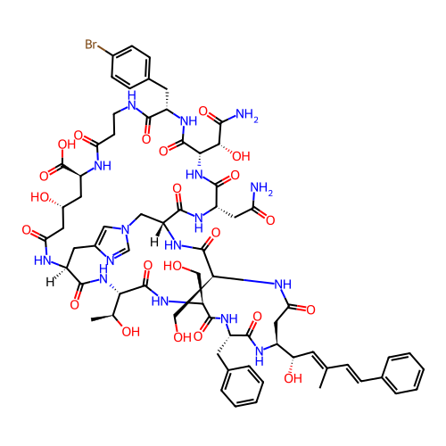 | SMILES | CC(/C=C/C1=CC=CC=C1)=C\[C@H](O)[C@@H]1CC(=O)N[C@@H](CO)C(=O)N[C@@H]2CN3C=NC(=C3)C[C@H](NC(=O)C[C@H](O)C[C@@H](C(=O)O)NC(=O)CCNC(=O)[C@H](CC3=CC=C(Br)C=C3)NC(=O)[C@H]([C@@H](O)C(N)=O)NC(=O)[C@H](CC(N)=O)NC2=O)C(=O)N[C@@H]([C@H](C)O)C(=O)N[C@@H](CO)C(=O)N[C@@H](CC2=CC=CC=C2)C(=O)N1 |