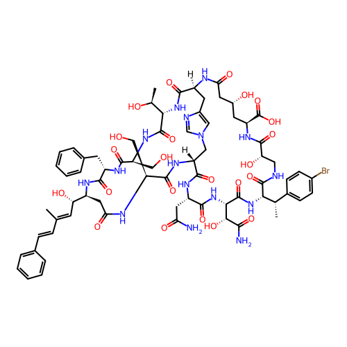 | SMILES | CC(/C=C/C1=CC=CC=C1)=C\[C@H](O)[C@@H]1CC(=O)N[C@@H](CO)C(=O)N[C@@H]2CN3C=NC(=C3)C[C@H](NC(=O)C[C@H](O)C[C@@H](C(=O)O)NC(=O)[C@@H](O)CNC(=O)[C@H]([C@@H](C)C3=CC=C(Br)C=C3)NC(=O)[C@H]([C@@H](O)C(N)=O)NC(=O)[C@H](CC(N)=O)NC2=O)C(=O)N[C@@H]([C@H](C)O)C(=O)N[C@@H](CO)C(=O)N[C@@H](CC2=CC=CC=C2)C(=O)N1 |
