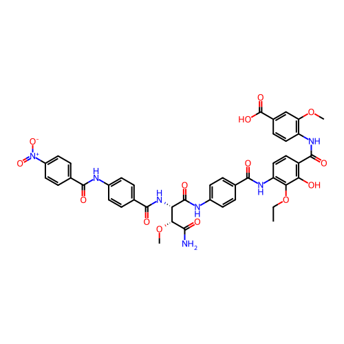 | SMILES | CCOC1=C(NC(=O)C2=CC=C(NC(=O)[C@@H](NC(=O)C3=CC=C(NC(=O)C4=CC=C([N+](=O)[O-])C=C4)C=C3)[C@@H](OC)C(N)=O)C=C2)C=CC(C(=O)NC2=C(OC)C=C(C(=O)O)C=C2)=C1O |