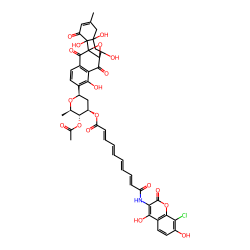 | SMILES | CC(=O)O[C@@H]1[C@@H](C)O[C@@H](C2=C(O)C3=C(C=C2)C(=O)C24OC2(C3=O)C(O)CC2(O)CC(C)=CC(=O)C24O)C[C@H]1OC(=O)/C=C/C=C/C=C/C=C/C(=O)NC1=C(O)C2=C(OC1=O)C(Cl)=C(O)C=C2 |