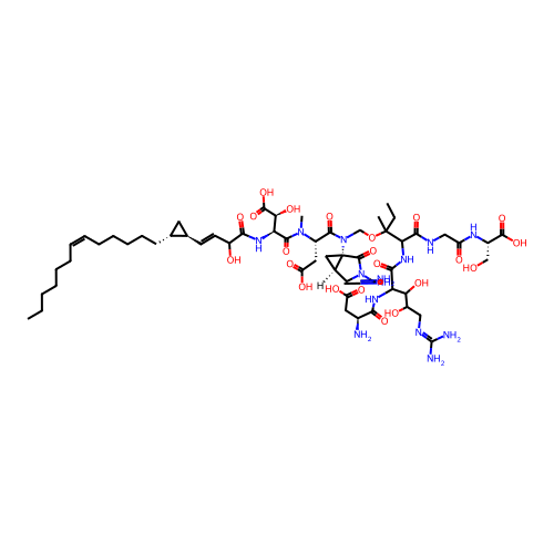 | SMILES | CCCCCC/C=C\CCCCC[C@@H]1C[C@H]1/C=C/C(O)C(=O)N[C@H](C(=O)N(C)[C@@H](CC(=O)O)C(=O)N(COC(C)(CC)C(NC(=O)C(NC(=O)[C@@H](N)CC(=O)O)C(O)C(O)CN=C(N)N)C(=O)NCC(=O)N[C@@H](CO)C(=O)O)[C@@]12C[C@@H]1CN(C(=N)N)C2=O)[C@H](O)C(=O)O |