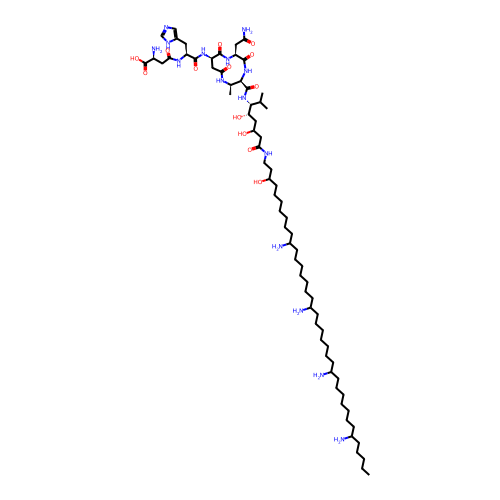 | SMILES | CCCCCC(N)CCCCCCCC(N)CCCCCCCC(N)CCCCCCCC(N)CCCCCCCC(O)CCNC(=O)CC(O)C[C@H](O)[C@H](NC(=O)[C@@H]1NC(=O)[C@H](CC(N)=O)NC(=O)[C@H](NC(=O)[C@H](CC2=CN=CN2)NC(=O)C[C@H](N)C(=O)O)CC(=O)N[C@@H]1C)C(C)C |