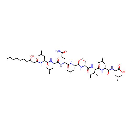 | SMILES | CCCCCCC[C@@H](O)CC(=O)N[C@@H](CC(C)C)C(=O)N[C@@H](CC(C)C)C(=O)N[C@H](CCC(N)=O)C(=O)N[C@@H](CC(C)C)C(=O)N[C@H](CO)C(=O)N[C@H](C(=O)N[C@H](CC(C)C)C(=O)N[C@@H](CC(C)C)C(=O)O)[C@@H](C)CC |