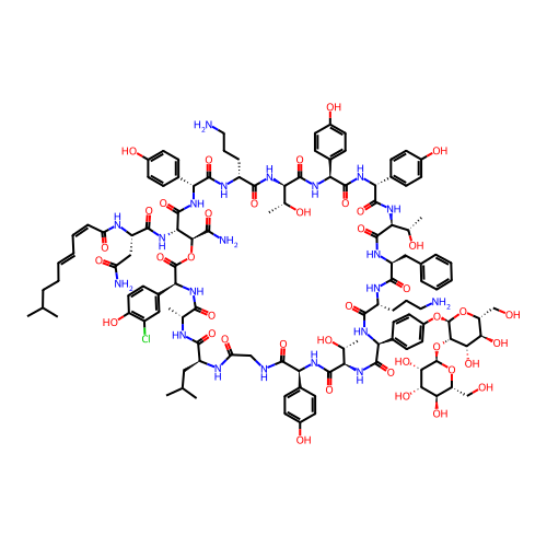 InChI=1S/C120H156ClN21O40/c1-55(2)18-12-9-10-15-23-83(154)128-78(51-82(124)153)108(167)142-94-100(102(125)161)181-118(177)93(67-34-45-79(152)73(121)50-67)141-103(162)57(5)127-106(165)76(48-56(3)4)129-84(155)52-126-109(168)88(62-24-35-68(148)36-25-62)137-112(171)87(60(8)147)135-114(173)90(66-32-43-72(44-33-66)178-120-101(98(159)96(157)81(54-144)180-120)182-119-99(160)97(158)95(156)80(53-143)179-119)136-105(164)74(21-16-46-122)130-107(166)77(49-61-19-13-11-14-20-61)132-110(169)85(58(6)145)134-115(174)91(64-28-39-70(150)40-29-64)139-116(175)92(65-30-41-71(151)42-31-65)138-111(170)86(59(7)146)133-104(163)75(22-17-47-123)131-113(172)89(140-117(94)176)63-26-37-69(149)38-27-63/h9-11,13-15,19-20,23-45,50,55-60,74-78,80-81,85-101,119-120,143-152,156-160H,12,16-18,21-22,46-49,51-54,122-123H2,1-8H3,(H2,124,153)(H2,125,161)(H,126,168)(H,127,165)(H,128,154)(H,129,155)(H,130,166)(H,131,172)(H,132,169)(H,133,163)(H,134,174)(H,135,173)(H,136,164)(H,137,171)(H,138,170)(H,139,175)(H,140,176)(H,141,162)(H,142,167)/b10-9+,23-15-/t57-,58+,59-,60-,74-,75-,76+,77+,78+,80-,81-,85+,86-,87-,88+,89-,90+,91-,92+,93+,94+,95-,96-,97+,98+,99+,100+,101+,119-,120+/m1/s1 |