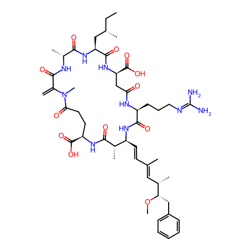 | SMILES | C=C1C(=O)N[C@H](C)C(=O)N[C@@H](C[C@@H](C)CC)C(=O)N[C@@H](C(=O)O)CC(=O)N[C@@H](CCCN=C(N)N)C(=O)N[C@@H](/C=C/C(C)=C/[C@H](C)[C@H](CC2=CC=CC=C2)OC)[C@H](C)C(=O)N[C@@H](C(=O)O)CCC(=O)N1C |
