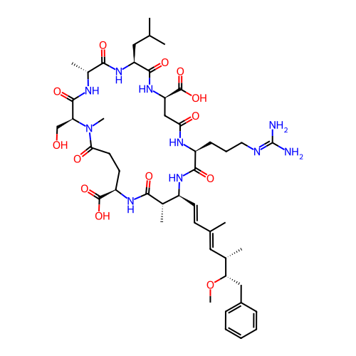 | SMILES | CO[C@@H](CC1=CC=CC=C1)[C@@H](C)/C=C(C)/C=C/[C@@H]1NC(=O)[C@H](CCCN=C(N)N)NC(=O)C[C@H](C(=O)O)NC(=O)[C@H](CC(C)C)NC(=O)[C@@H](C)NC(=O)[C@H](CO)N(C)C(=O)CC[C@H](C(=O)O)NC(=O)[C@H]1C |
