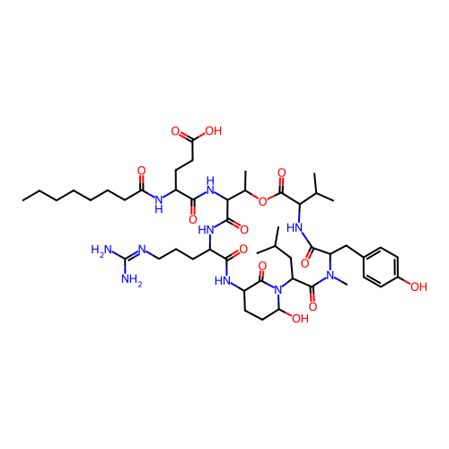 | SMILES | CCCCCCCC(=O)NC(CCC(=O)O)C(=O)NC1C(=O)NC(CCCN=C(N)N)C(=O)NC2CCC(O)N(C2=O)C(CC(C)C)C(=O)N(C)C(CC2=CC=C(O)C=C2)C(=O)NC(C(C)C)C(=O)OC1C |