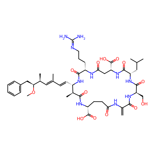 | SMILES | C=C1NC(=O)CC[C@H](C(=O)O)NC(=O)[C@@H](C)[C@H](/C=C/C(C)=C/[C@H](C)[C@H](CC2=CC=CC=C2)OC)NC(=O)[C@H](CCCN=C(N)N)NC(=O)C[C@H](C(=O)O)NC(=O)[C@H](CC(C)C)NC(=O)[C@@H](CO)NC1=O |