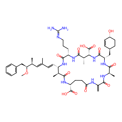 | SMILES | C=C1NC(=O)CC[C@H](C(=O)O)NC(=O)[C@@H](C)[C@H](/C=C/C(C)=C/[C@H](C)[C@H](CC2=CC=CC=C2)OC)NC(=O)[C@H](CCCN=C(N)N)NC(=O)[C@@H](C)[C@H](C(=O)O)NC(=O)[C@H](C[C@H]2C=C[C@H](O)CC2)NC(=O)[C@@H](C)NC1=O |