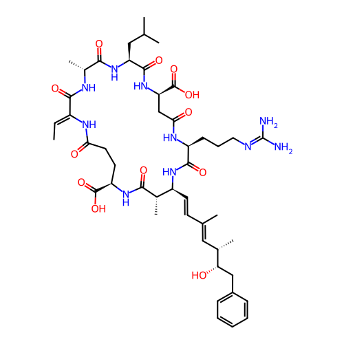 | SMILES | C/C=C1\NC(=O)CC[C@H](C(=O)O)NC(=O)[C@@H](C)[C@H](/C=C/C(C)=C/[C@H](C)[C@@H](O)CC2=CC=CC=C2)NC(=O)[C@H](CCCN=C(N)N)NC(=O)C[C@H](C(=O)O)NC(=O)[C@H](CC(C)C)NC(=O)[C@@H](C)NC1=O |