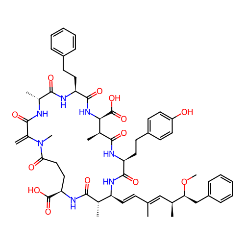 | SMILES | C=C1C(=O)N[C@H](C)C(=O)N[C@@H](CCC2=CC=CC=C2)C(=O)N[C@@H](C(=O)O)[C@H](C)C(=O)N[C@@H](CCC2=CC=C(O)C=C2)C(=O)N[C@@H](/C=C/C(C)=C/[C@H](C)[C@H](CC2=CC=CC=C2)OC)[C@H](C)C(=O)N[C@@H](C(=O)O)CCC(=O)N1C |
