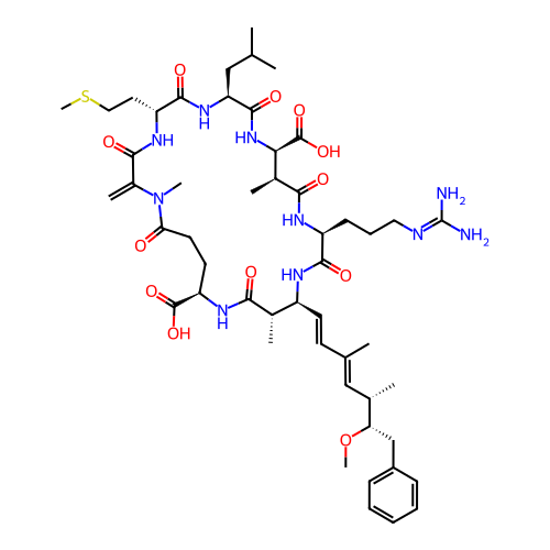 | SMILES | C=C1C(=O)N[C@H](CCSC)C(=O)N[C@@H](CC(C)C)C(=O)N[C@@H](C(=O)O)[C@H](C)C(=O)N[C@@H](CCCN=C(N)N)C(=O)N[C@@H](/C=C/C(C)=C/[C@H](C)[C@H](CC2=CC=CC=C2)OC)[C@H](C)C(=O)N[C@@H](C(=O)O)CCC(=O)N1C |