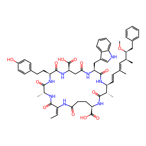 | SMILES | C/C=C1/NC(=O)CC[C@H](C(=O)O)NC(=O)[C@@H](C)[C@H](/C=C/C(C)=C/[C@H](C)[C@H](CC2=CC=CC=C2)OC)NC(=O)[C@H](CC2=C[NH]C3=CC=CC=C23)NC(=O)C[C@H](C(=O)O)NC(=O)[C@H](CCC2=CC=C(O)C=C2)NC(=O)[C@@H](C)NC1=O |