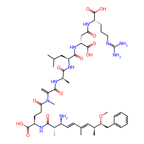 | SMILES | C=C(C(=O)N[C@H](C)C(=O)N[C@@H](CC(C)C)C(=O)N[C@H](CC(=O)N[C@@H](CCCN=C(N)N)C(=O)O)C(=O)O)N(C)C(=O)CC[C@@H](NC(=O)[C@@H](C)[C@@H](N)/C=C/C(C)=C/[C@H](C)[C@H](CC1=CC=CC=C1)OC)C(=O)O |