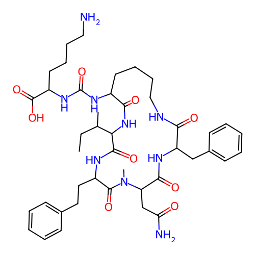 | SMILES | CCC(C)C1NC(=O)C(NC(=O)NC(CCCCN)C(=O)O)CCCCNC(=O)C(CC2=CC=CC=C2)NC(=O)C(CC(N)=O)N(C)C(=O)C(CCC2=CC=CC=C2)NC1=O |