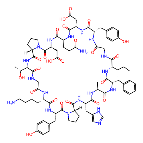 | SMILES | CC[C@H](C)[C@@H]1NC(=O)[C@H](CC2=CC=CC=C2)NC(=O)[C@H](C)NC(=O)[C@H](CC2=CN=C[NH]2)NC(=O)[C@@H]2CCCN2C(=O)[C@H](CC2=CC=C(O)C=C2)NC(=O)[C@H](CCCCN)NC(=O)CNC(=O)[C@H]([C@@H](C)O)NC(=O)[C@@H]2CCCN2C(=O)[C@H](CC(=O)O)NC(=O)[C@H](CCC(N)=O)NC(=O)[C@H](CC(=O)O)NC(=O)[C@H](CC2=CC=C(O)C=C2)NC(=O)CNC1=O |