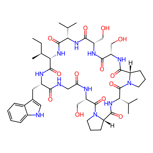 | SMILES | CC[C@H](C)[C@@H]1NC(=O)[C@H](C(C)C)NC(=O)[C@H](CO)NC(=O)[C@H](CO)NC(=O)[C@@H]2CCCN2C(=O)[C@H](C(C)C)NC(=O)[C@@H]2CCCN2C(=O)[C@H](CO)NC(=O)CNC(=O)[C@H](CC2=C[NH]C3=CC=CC=C23)NC1=O |
