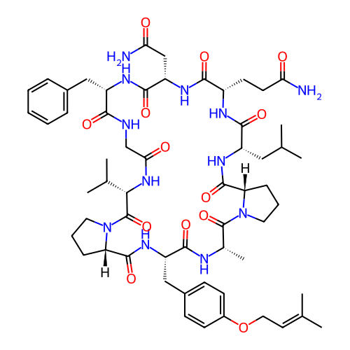 | SMILES | CC(C)=CCOC1=CC=C(C[C@@H]2NC(=O)[C@@H]3CCCN3C(=O)[C@H](C(C)C)NC(=O)CNC(=O)[C@H](CC3=CC=CC=C3)NC(=O)[C@H](CC(N)=O)NC(=O)[C@H](CCC(N)=O)NC(=O)[C@H](CC(C)C)NC(=O)[C@@H]3CCCN3C(=O)[C@H](C)NC2=O)C=C1 |