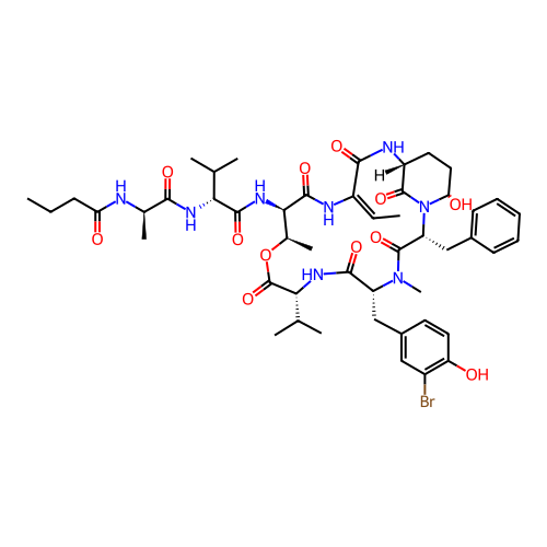| SMILES | CC=C1NC(=O)[C@H](NC(=O)[C@H](NC(=O)[C@@H](C)NC(=O)CCC)C(C)C)[C@@H](C)OC(=O)[C@@H](C(C)C)NC(=O)[C@@H](CC2=CC(Br)=C(O)C=C2)N(C)C(=O)[C@@H](CC2=CC=CC=C2)N2C(=O)[C@@H](CC[C@@H]2O)NC1=O |