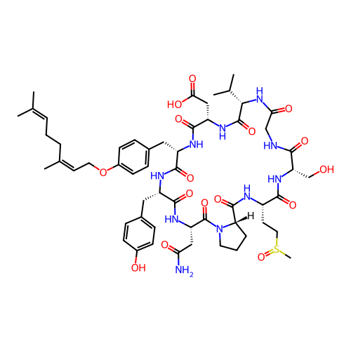 | SMILES | CC(C)=CCC/C(C)=C\COC1=CC=C(C[C@@H]2NC(=O)[C@H](CC(=O)O)NC(=O)[C@H](C(C)C)NC(=O)CNC(=O)[C@H](CO)NC(=O)[C@H](CCS(C)=O)NC(=O)[C@@H]3CCCN3C(=O)[C@H](CC(N)=O)NC(=O)[C@H](CC3=CC=C(O)C=C3)NC2=O)C=C1 |