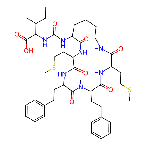 | SMILES | CCC(C)C(NC(=O)NC1CCCCNC(=O)C(CCSC)NC(=O)C(CCC2=CC=CC=C2)N(C)C(=O)C(CCC2=CC=CC=C2)NC(=O)C(CCSC)NC1=O)C(=O)O |