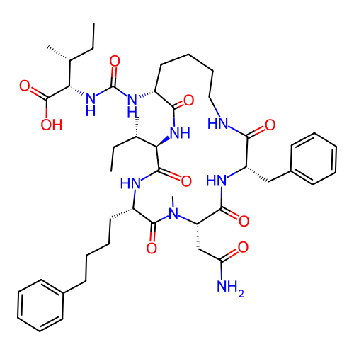 | SMILES | CC[C@H](C)[C@H]1NC(=O)[C@H](NC(=O)N[C@H](C(=O)O)[C@H](C)CC)CCCCNC(=O)[C@H](CC2=CC=CC=C2)NC(=O)[C@H](CC(N)=O)N(C)C(=O)[C@H](CCCCC2=CC=CC=C2)NC1=O |