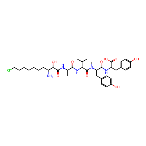 | SMILES | CC(NC(=O)C(O)C(N)CCCCCCCCl)C(=O)NC(C(=O)N(C)C(CC1=CC=C(O)C=C1)C(=O)NC(CC1=CC=C(O)C=C1)C(=O)O)C(C)C |