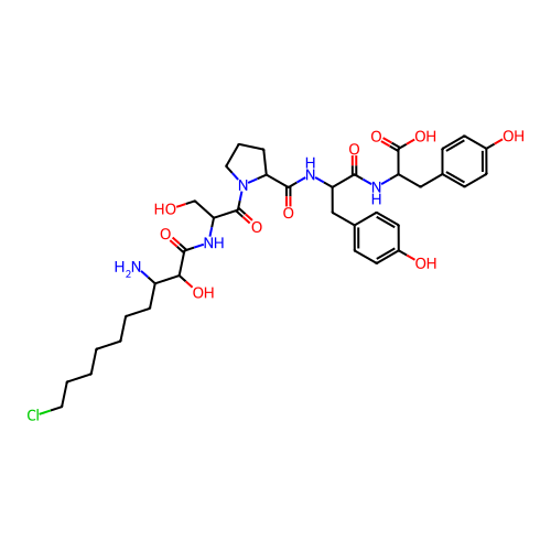 | SMILES | NC(CCCCCCCCl)C(O)C(=O)NC(CO)C(=O)N1CCCC1C(=O)NC(CC1=CC=C(O)C=C1)C(=O)NC(CC1=CC=C(O)C=C1)C(=O)O |