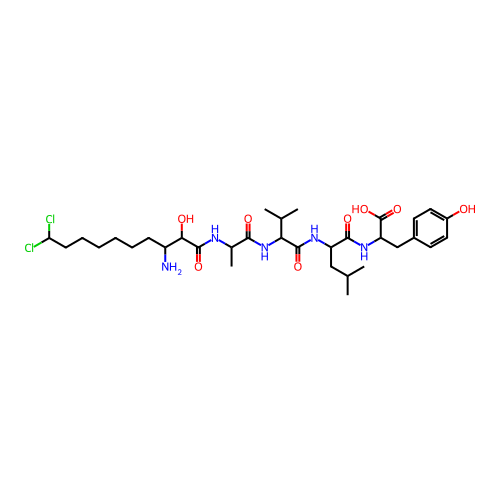 | SMILES | CC(C)CC(NC(=O)C(NC(=O)C(C)NC(=O)C(O)C(N)CCCCCCC(Cl)Cl)C(C)C)C(=O)NC(CC1=CC=C(O)C=C1)C(=O)O |