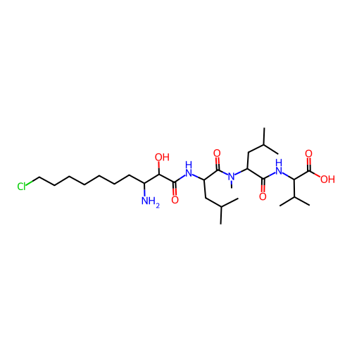 | SMILES | CC(C)CC(NC(=O)C(O)C(N)CCCCCCCCl)C(=O)N(C)C(CC(C)C)C(=O)NC(C(=O)O)C(C)C |