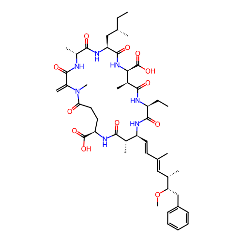| SMILES | C=C1C(=O)N[C@H](C)C(=O)N[C@@H](C[C@@H](C)CC)C(=O)N[C@@H](C(=O)O)[C@H](C)C(=O)N[C@@H](CC)C(=O)N[C@@H](/C=C/C(C)=C/[C@H](C)[C@H](CC2=CC=CC=C2)OC)[C@H](C)C(=O)N[C@@H](C(=O)O)CCC(=O)N1C |