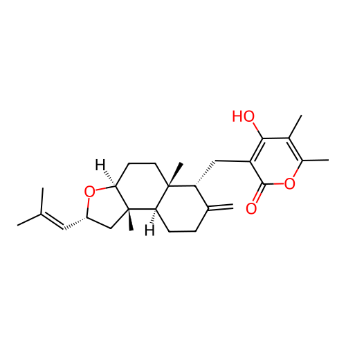 | InChI | InChI=1S/C27H38O4/c1-15(2)12-19-14-27(7)22-9-8-16(3)21(26(22,6)11-10-23(27)31-19)13-20-24(28)17(4)18(5)30-25(20)29/h12,19,21-23,28H,3,8-11,13-14H2,1-2,4-7H3/t19-,21+,22+,23-,26+,27-/m0/s1 |