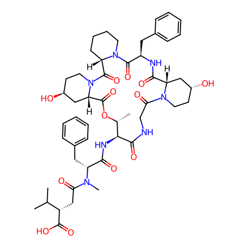| SMILES | CC(C)[C@H](CC(=O)N(C)[C@H](CC1=CC=CC=C1)C(=O)N[C@@H]1C(=O)NCC(=O)N2CC[C@@H](O)C[C@H]2C(=O)N[C@H](CC2=CC=CC=C2)C(=O)N2CCCC[C@H]2C(=O)N2CC[C@H](O)C[C@H]2C(=O)O[C@@H]1C)C(=O)O |