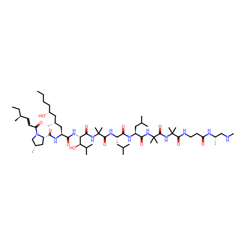 | SMILES | CCCC[C@@H](O)C[C@@H](C)C[C@H](NC(=O)[C@@H]1C[C@H](C)CN1C(=O)/C=C/[C@@H](C)CC)C(=O)N[C@H](C(=O)NC(C)(C)C(=O)N[C@@H](CC(C)C)C(=O)N[C@@H](CC(C)C)C(=O)NC(C)(C)C(=O)NC(C)(C)C(=O)NCCC(=O)N[C@@H](C)CNC)[C@H](O)C(C)C |