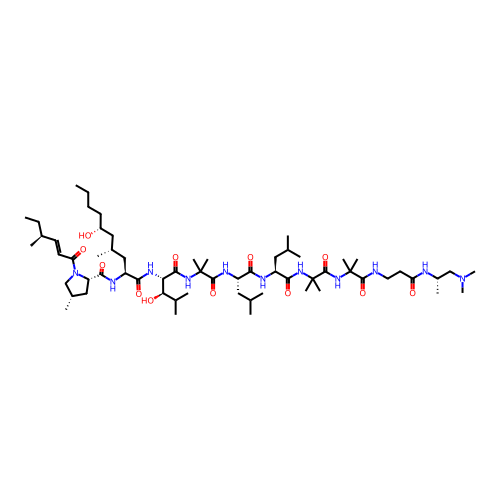| SMILES | CCCC[C@@H](O)C[C@@H](C)C[C@H](NC(=O)[C@@H]1C[C@H](C)CN1C(=O)/C=C/[C@@H](C)CC)C(=O)N[C@H](C(=O)NC(C)(C)C(=O)N[C@@H](CC(C)C)C(=O)N[C@@H](CC(C)C)C(=O)NC(C)(C)C(=O)NC(C)(C)C(=O)NCCC(=O)N[C@@H](C)CN(C)C)[C@H](O)C(C)C |