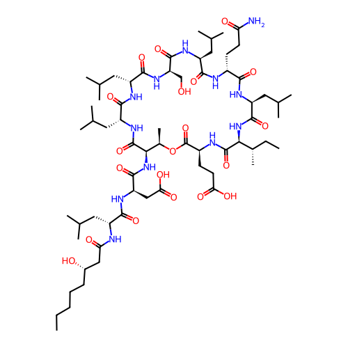 | SMILES | CCCCC[C@H](O)CC(=O)N[C@H](CC(C)C)C(=O)N[C@H](CC(=O)O)C(=O)N[C@H]1C(=O)N[C@H](CC(C)C)C(=O)N[C@H](CC(C)C)C(=O)N[C@H](CO)C(=O)N[C@@H](CC(C)C)C(=O)N[C@H](CCC(N)=O)C(=O)N[C@@H](CC(C)C)C(=O)N[C@@H]([C@@H](C)CC)C(=O)N[C@@H](CCC(=O)O)C(=O)O[C@@H]1C |