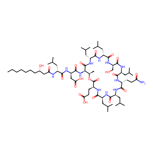 | SMILES | CCCCCCC[C@H](O)CC(=O)N[C@H](CC(C)C)C(=O)N[C@H](CC(=O)O)C(=O)N[C@H]1C(=O)N[C@H](CC(C)C)C(=O)N[C@H](CC(C)C)C(=O)N[C@H](CO)C(=O)N[C@@H](CC(C)C)C(=O)N[C@H](CCC(N)=O)C(=O)N[C@@H](CC(C)C)C(=O)N[C@@H](CC(C)C)C(=O)N[C@@H](CCC(=O)O)C(=O)O[C@@H]1C |