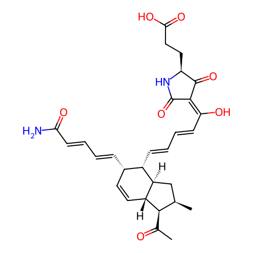 | InChI | InChI=1S/C29H34N2O7/c1-16-15-21-19(18(7-3-6-10-24(30)34)11-12-20(21)26(16)17(2)32)8-4-5-9-23(33)27-28(37)22(31-29(27)38)13-14-25(35)36/h3-12,16,18-22,26,33H,13-15H2,1-2H3,(H2,30,34)(H,31,38)(H,35,36)/b7-3+,8-4+,9-5+,10-6+,27-23?/t16-,18+,19+,20-,21-,22+,26+/m1/s1 |