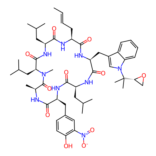 | SMILES | C/C=C/C[C@@H]1NC(=O)[C@H](CC(C)C)NC(=O)[C@H](CC(C)C)N(C)C(=O)[C@H](C)NC(=O)[C@H](CC2=CC([N+](=O)[O-])=C(O)C=C2)NC(=O)[C@H](CC(C)C)NC(=O)[C@H](CC2=CN(C(C)(C)[C@H]3CO3)C3=CC=CC=C23)NC1=O |