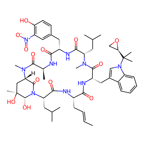 | SMILES | C/C=C/C[C@@H]1NC(=O)[C@H](CC(C)C)N2C(=O)[C@H](C[C@](C)(O)[C@H]2O)N(C)C(=O)[C@H](C)NC(=O)[C@H](CC2=CC([N+](=O)[O-])=C(O)C=C2)NC(=O)[C@H](CC(C)C)N(C)C(=O)[C@H](CC2=CN(C(C)(C)[C@H]3CO3)C3=CC=CC=C23)NC1=O |