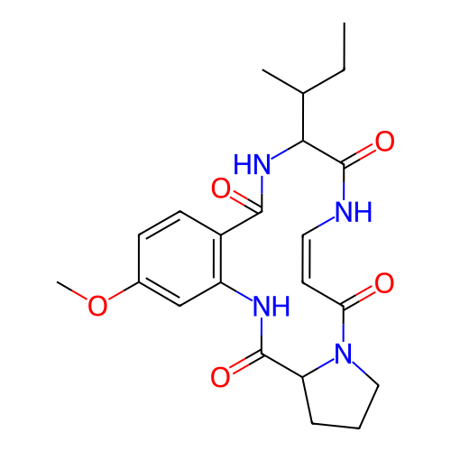 | SMILES | CCC(C)C1NC(=O)C2=C(C=C(OC)C=C2)NC(=O)C2CCCN2C(=O)/C=C\NC1=O |