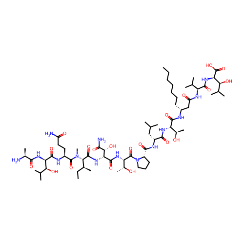 | SMILES | CCCCCCC[C@H](CC(=O)N[C@H](C(=O)N[C@@H](C(=O)O)[C@@H](O)C(C)C)C(C)C)NC(=O)[C@@H](NC(=O)[C@@H](CC(C)C)NC(=O)[C@@H]1CCCN1C(=O)[C@@H](NC(=O)[C@H](NC(=O)[C@H]([C@@H](C)CC)N(C)C(=O)[C@H](CCC(N)=O)NC(=O)[C@H](NC(=O)[C@H](C)N)[C@@H](O)C(C)C)[C@@H](O)C(N)=O)[C@@H](C)O)[C@@H](C)O |