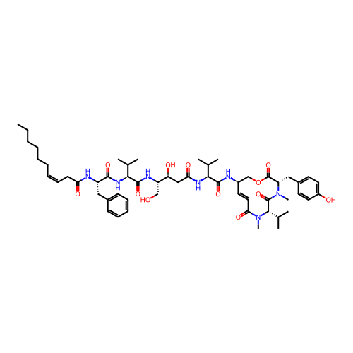 | InChI | InChI=1S/C55H81N7O12/c1-10-11-12-13-14-15-19-22-45(66)57-41(29-37-20-17-16-18-21-37)51(69)60-49(35(4)5)53(71)58-42(32-63)44(65)31-46(67)59-48(34(2)3)52(70)56-39-25-28-47(68)62(9)50(36(6)7)54(72)61(8)43(55(73)74-33-39)30-38-23-26-40(64)27-24-38/h15-21,23-28,34-36,39,41-44,48-50,63-65H,10-14,22,29-33H2,1-9H3,(H,56,70)(H,57,66)(H,58,71)(H,59,67)(H,60,69)/b19-15-,28-25+/t39-,41+,42+,43+,44+,48+,49+,50+/m1/s1 |