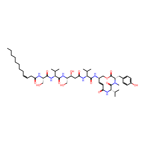| SMILES | CCCCCCCC/C=C\CC(=O)N[C@@H](CO)C(=O)N[C@H](C(=O)N[C@@H](CO)[C@@H](O)CC(=O)N[C@H](C(=O)N[C@@H]1/C=C/C(=O)N[C@@H](C(C)C)C(=O)N(C)[C@@H](CC2=CC=C(O)C=C2)C(=O)OC1)C(C)C)C(C)C |