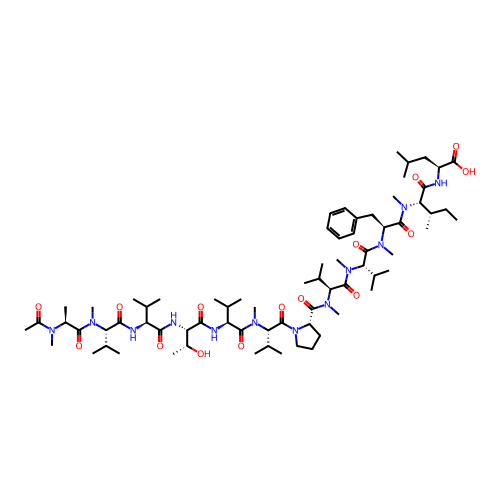 | SMILES | CC[C@H](C)[C@@H](C(=O)N[C@@H](CC(C)C)C(=O)O)N(C)C(=O)[C@H](CC1=CC=CC=C1)N(C)C(=O)[C@H](C(C)C)N(C)C(=O)[C@H](C(C)C)N(C)C(=O)[C@@H]1CCCN1C(=O)[C@H](C(C)C)N(C)C(=O)[C@@H](NC(=O)[C@@H](NC(=O)[C@@H](NC(=O)[C@H](C(C)C)N(C)C(=O)[C@H](C)N(C)C(C)=O)C(C)C)[C@@H](C)O)C(C)C |
